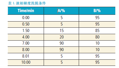流動(dòng)相:A:乙腈,B:水(含0.1 % 甲酸,2.0 mM 乙酸銨)