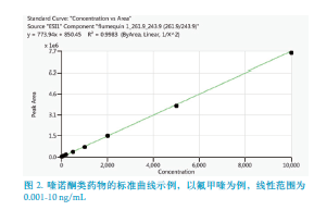 十六種喹諾酮類化合物的標(biāo)準(zhǔn)曲線線性見表3,氟甲喹標(biāo)準(zhǔn)工作曲線的濃度梯度為:0.001,0.002,0.005,0.1,0.2,0.5,1,2,5,10 ng/mL。圖2 為氟甲喹的標(biāo)準(zhǔn)曲線圖。