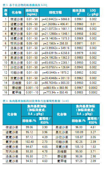 其余喹諾酮目標(biāo)化合物的標(biāo)準(zhǔn)曲線在0.01-50 ng/mL,依次為0.01,0.02,0.05,0.1,0.2,0.5,1.0,2.0,5.0,10.0,20.0,50.0 ng/mL。其中,諾氟沙星和環(huán)丙沙星為0.05-50 ng/mL,萘啶酸和氟甲喹為0.001-10 ng/mL。標(biāo)準(zhǔn)曲線范圍內(nèi)具有良好的線性(R2> 0.994);采用魚肉基質(zhì)作為加標(biāo)樣品,平行6 個(gè)樣品測(cè)試方法的回收率和方法重現(xiàn)性,詳細(xì)結(jié)果請(qǐng)見表4。從表4 可以看到,在加標(biāo)濃度為2 ng/mL 下,回收率為92.25-105.87 %,方法重現(xiàn)性為1.53-4.78%。最低定量限為0.0002-0.01μg/kg,完全符合殘留檢測(cè)要求。