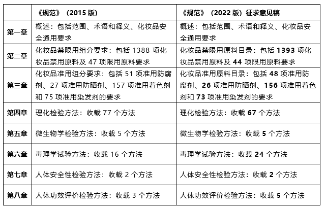為貫徹落實《化妝品監(jiān)督管理條例》的要求,進(jìn)一步完善化妝品安全技術(shù)法規(guī)體系,中國食品藥品檢定研究院于2022年3月31日,發(fā)布“中檢院關(guān)于公開征求《化妝品安全技術(shù)規(guī)范》修訂意見的通知”(以下簡稱為“通知”)。此次“通知”附件中 “《化妝品安全技術(shù)規(guī)范(2022年版)》征求意見稿”的構(gòu)架及主要內(nèi)容,與現(xiàn)行的《化妝品安全技術(shù)規(guī)范(2015年版)》對比如下